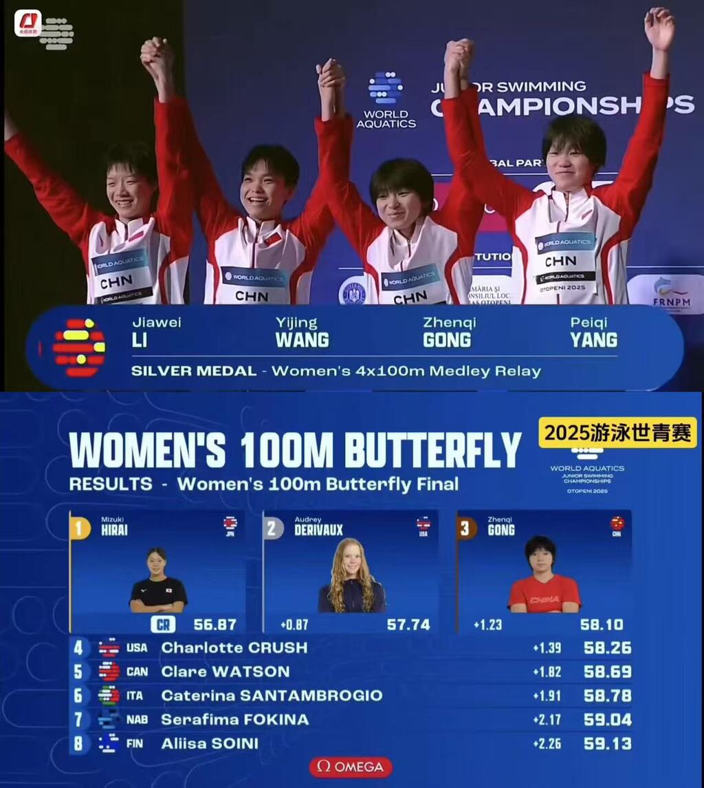 随后,龚真琦连续作战,与队友共同拼搏下以4分01秒37获得女子4×100米混合泳接力银牌,并在个人单项赛中收获女子100米蝶泳铜牌及200米蝶泳第四名。